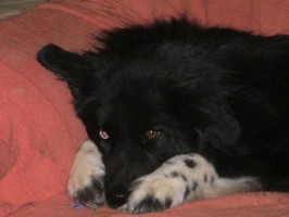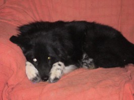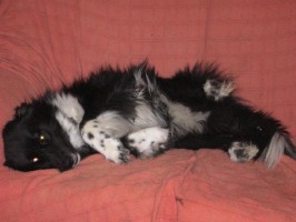 Lisa schläft ja immer Rücken an Rücken mit mir, um mich zu wärmen und sie hat sich überlegt, Lamberts Ohren zu wärmen. Sie schläft jede Nacht auf seinem Kopfkissen, direkt an seinem
