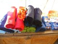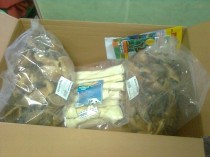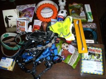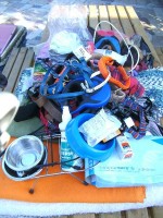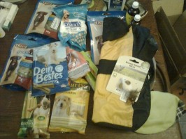 eines mit ganz tollen Leinen und Geschirren ganz viel Leckerchen, Kauknochen und Pansen. Einiges wurde schon verteilt.
